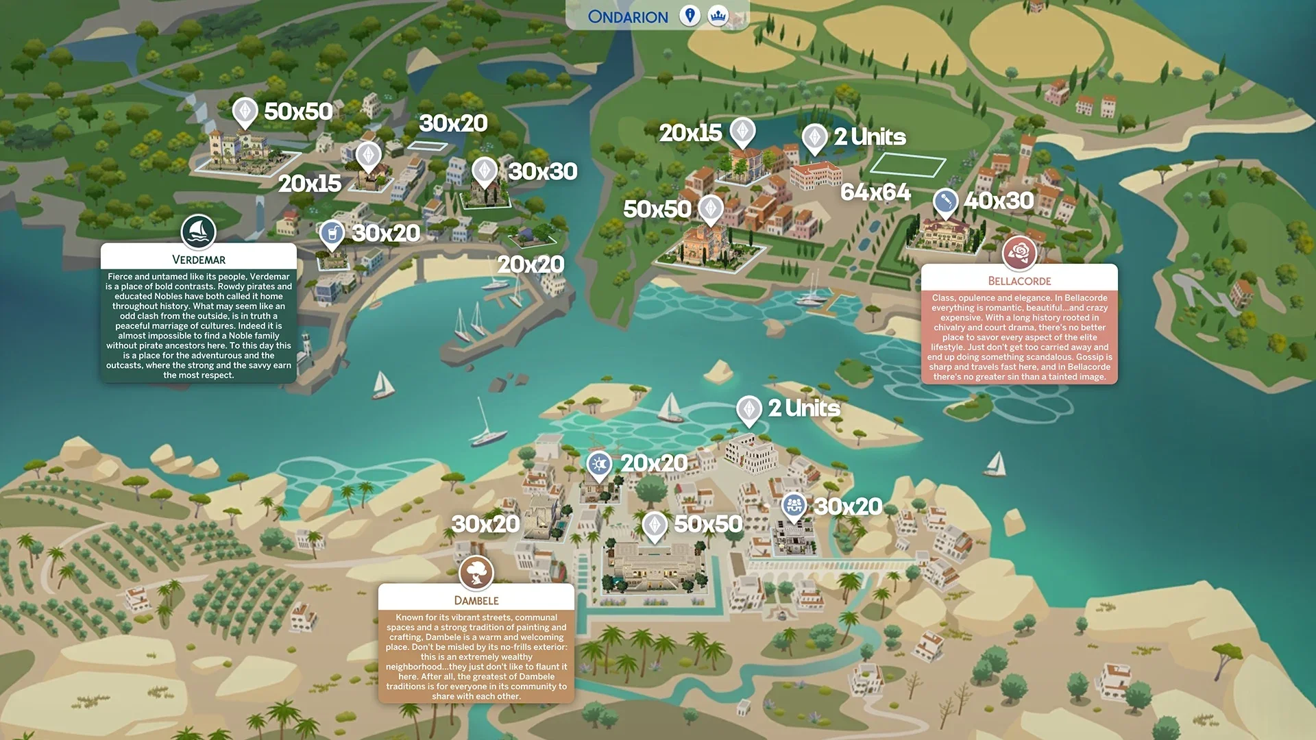Each of Ondarion’s regions comes with unique lots and sights – from palace-like estates and knight training grounds in Bellacorde, to colorful artisan markets and community gardens in Dambele, to ship harbors and secret caves in Verdemar.