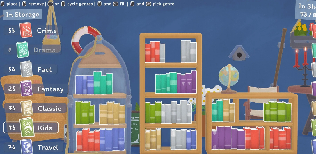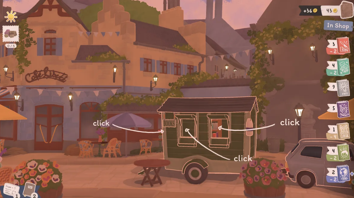 You start with a basic bookshelf. Each book you place increases the probability of selling that genre today, so make every shelf placement count. Tailor shelves to the crowd you expect, high-demand genres first, then niche ones that may trigger recommendations.