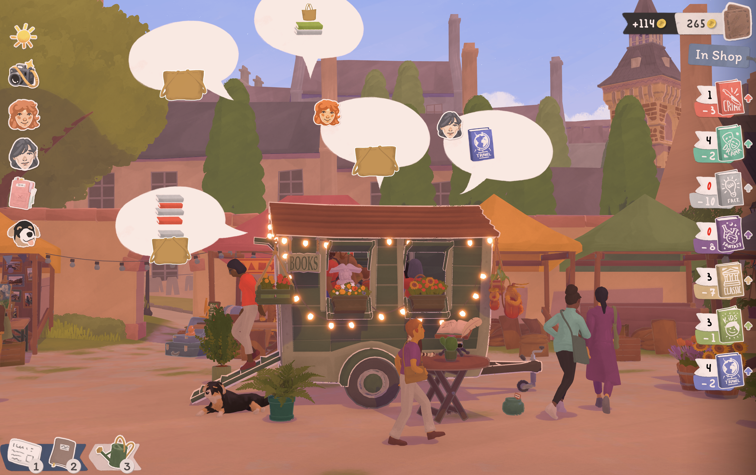 Customers sometimes ask for suggestions through dialogue prompts. These requests include genre clues such as topic, style, or even author type. Matching them well not only ensures a sale but also triggers an Inspiration buff, temporarily boosting overall sales chance across genres.